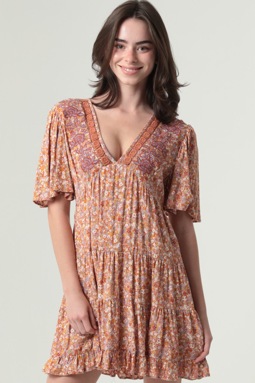 Stay stylish and comfy with this bohemian-inspired mini dress, perfect for warm, sunny days. Designed with a flattering deep V-neckline trimmed with delicate crochet, flutter sleeves, and a tiered ruffle hem, it combines feminine charm with relaxed comfort. The lightweight fabric moves with you, keeping you cool and comfortable all day long, while the all-over boho floral print in warm tones adds a playful, sun-kissed look.
