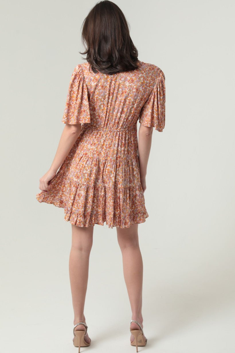 Details: Deep V-neck, flutter sleeves, tiered ruffle hem, boho floral print
