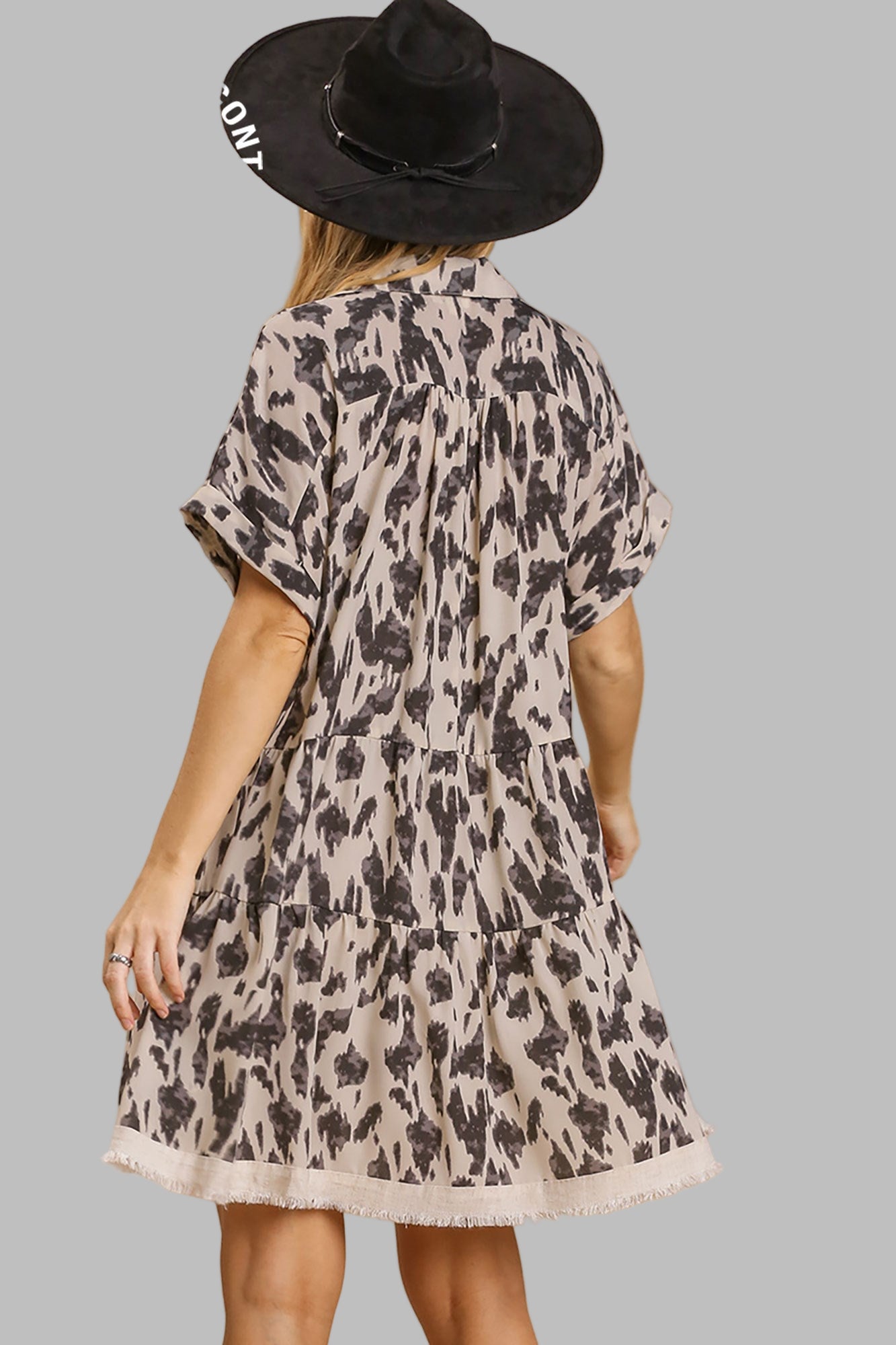 Unleash your wild side with our Animal Print Collared Split Neck Tiered Dress, a bold and versatile piece for effortless style. Featuring an eye-catching animal print, this dress brings statement-making charm to any wardrobe. The collared split neckline adds a polished, modern touch, while the tiered silhouette creates a breezy, flattering fit that moves beautifully with every step. A subtle frayed hemline adds an edgy, contemporary finish, balancing the playful print with a hint of attitude.