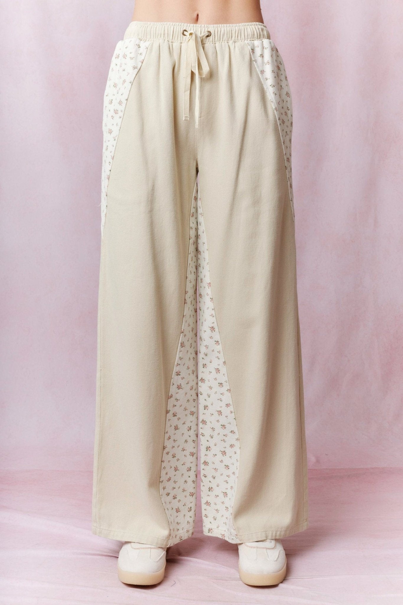 Beige Floral Contrast Wide Leg Pants – Relaxed & Effortlessly Chic