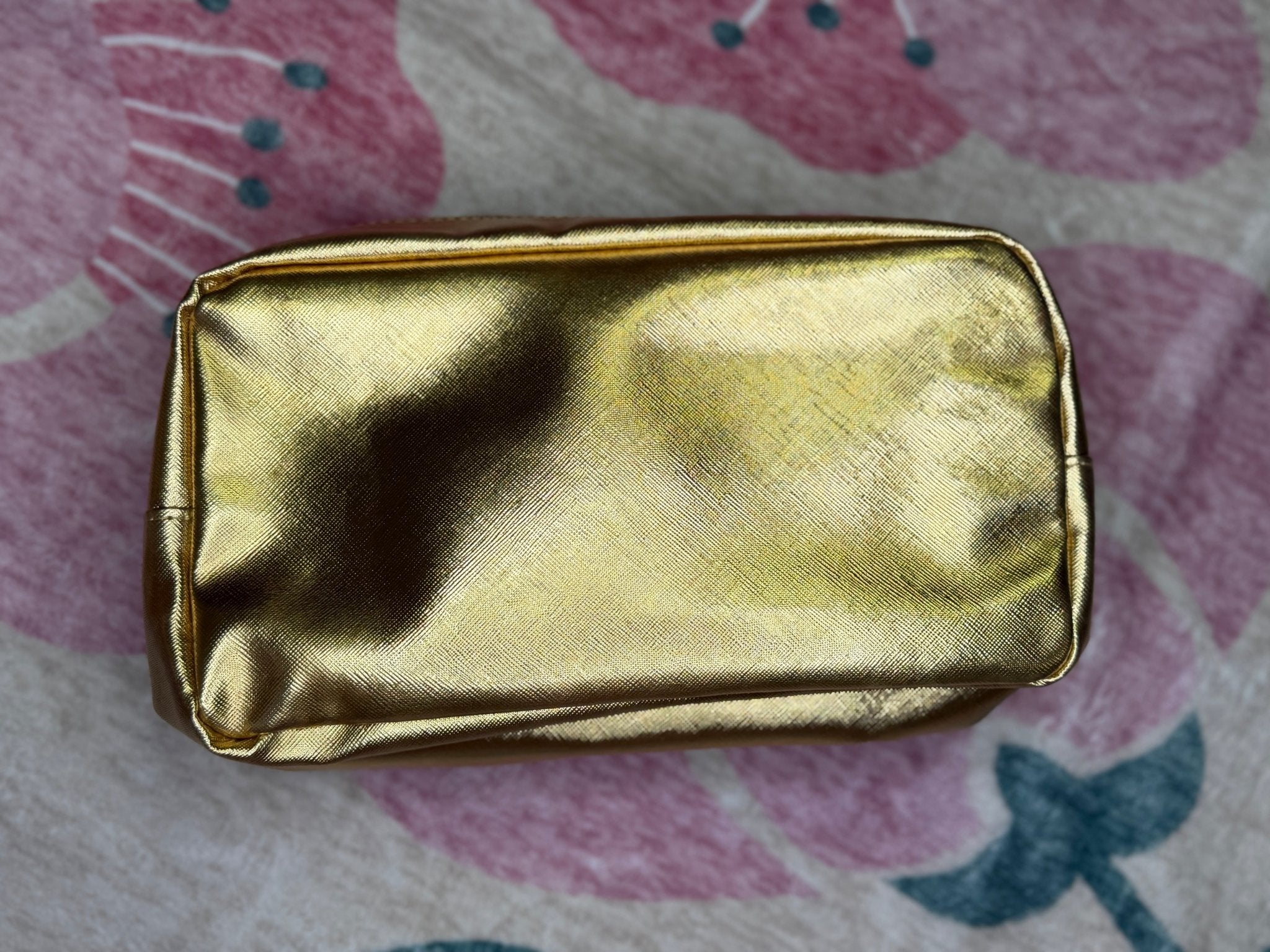 Measuring 9 inches long, 5 inches wide, and 4.5 inches tall, this travel bag provides ample storage with style. The shimmering gold finish adds a flirty, fun vibe that’s sure to turn heads wherever you go. Its durable construction ensures your makeup and accessories stay safe, while the structured design keeps everything in place.