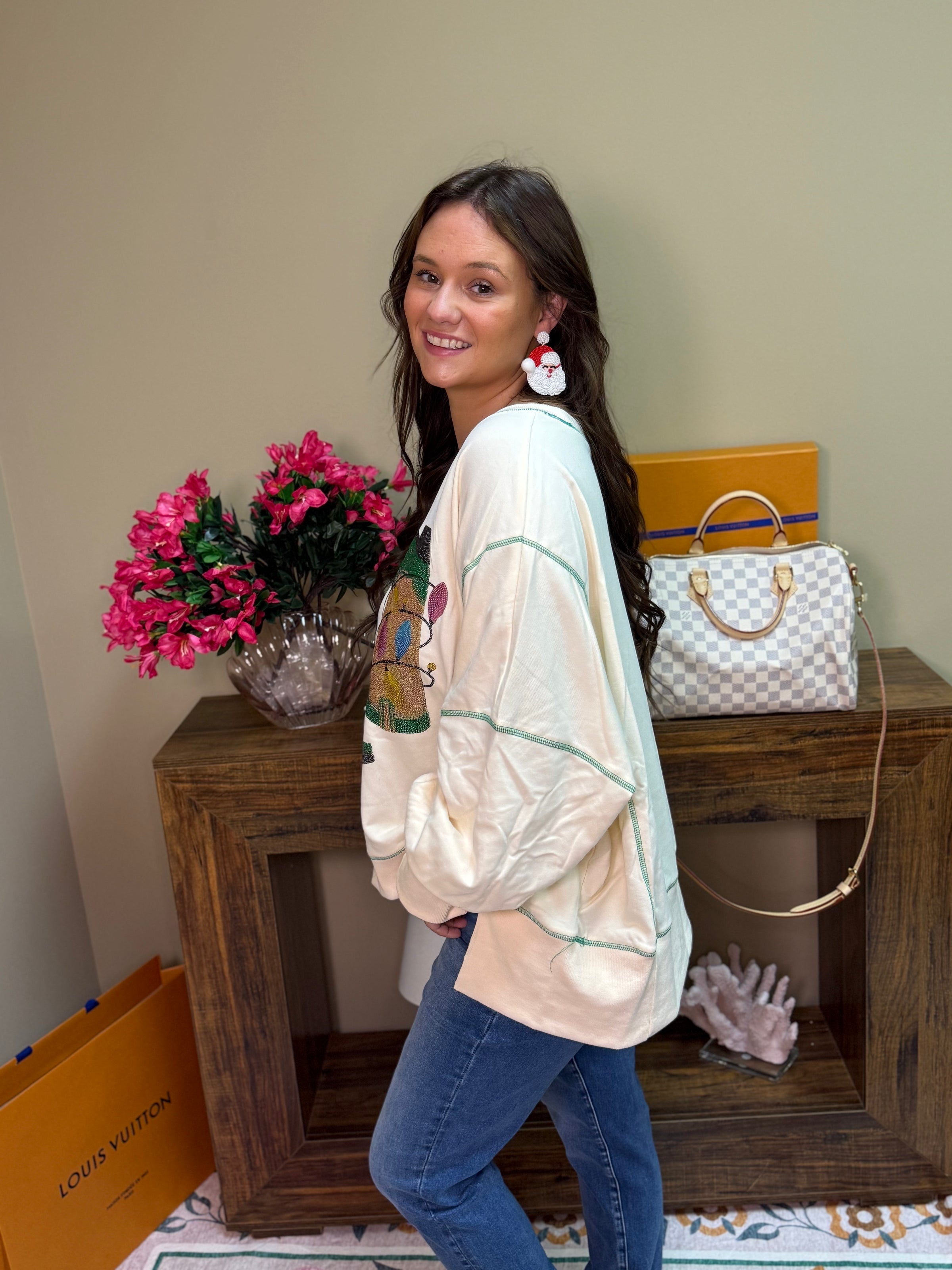 Celebrate the holidays in playful, sparkly style with this Multicolor Sequin Boot Christmas Sweater. Featuring a soft off-white base with green stitching and vibrant multicolor sequins, it brings festive cheer with a fun, eye-catching design. The oversized fit ensures comfort and a relaxed silhouette, while side slits on the sleeves add a modern, trendy touch.
