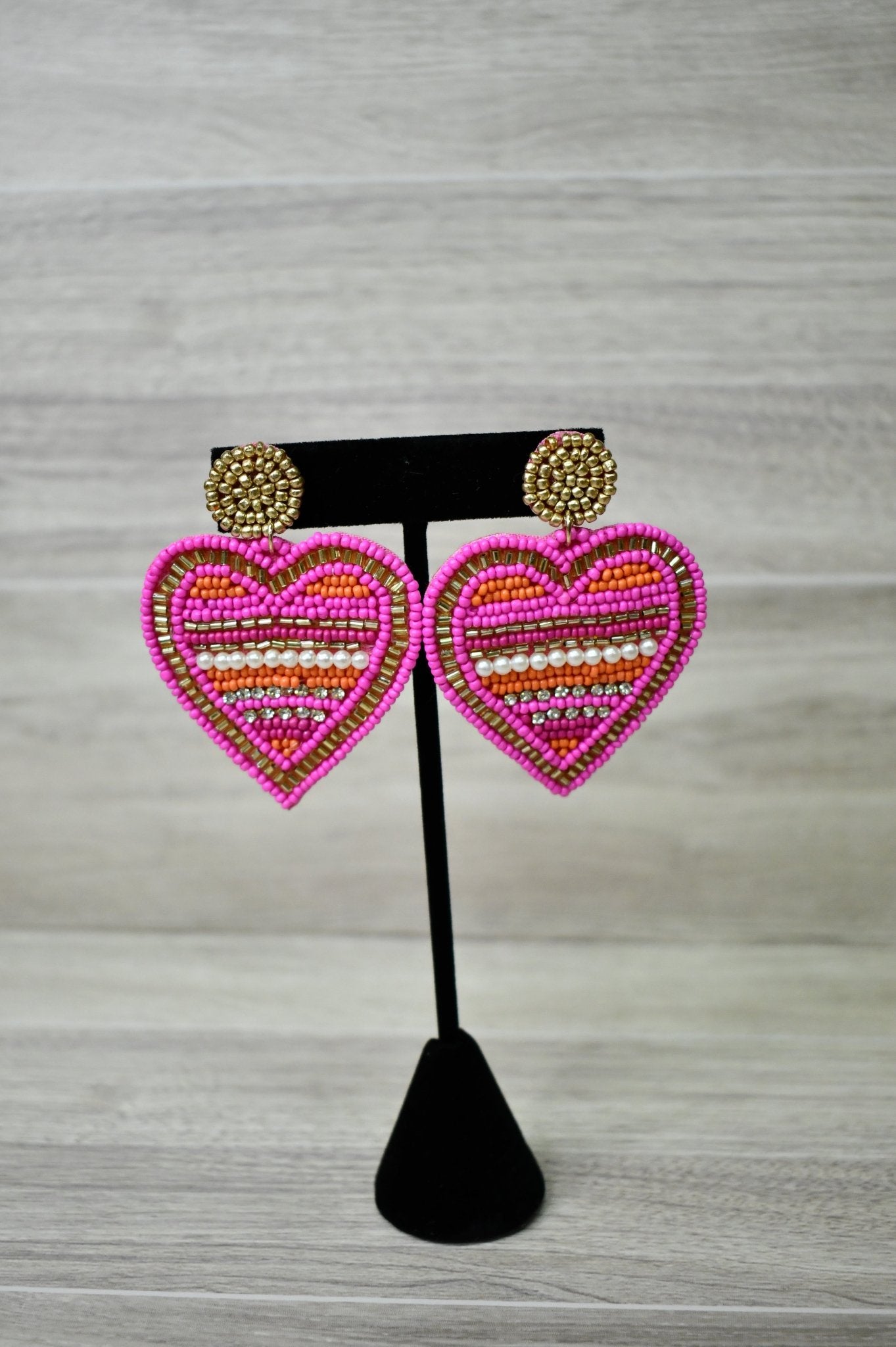 Talk about love at first sight! 💕 Our Pink Beaded Heart Earrings are bold, playful, and oh-so girly—just the pop of color your outfit has been waiting for. Hand-beaded with shades of pink, coral, and gold (plus a row of dainty pearls across the middle 😍), these statement hearts are as sweet as they are stylish.