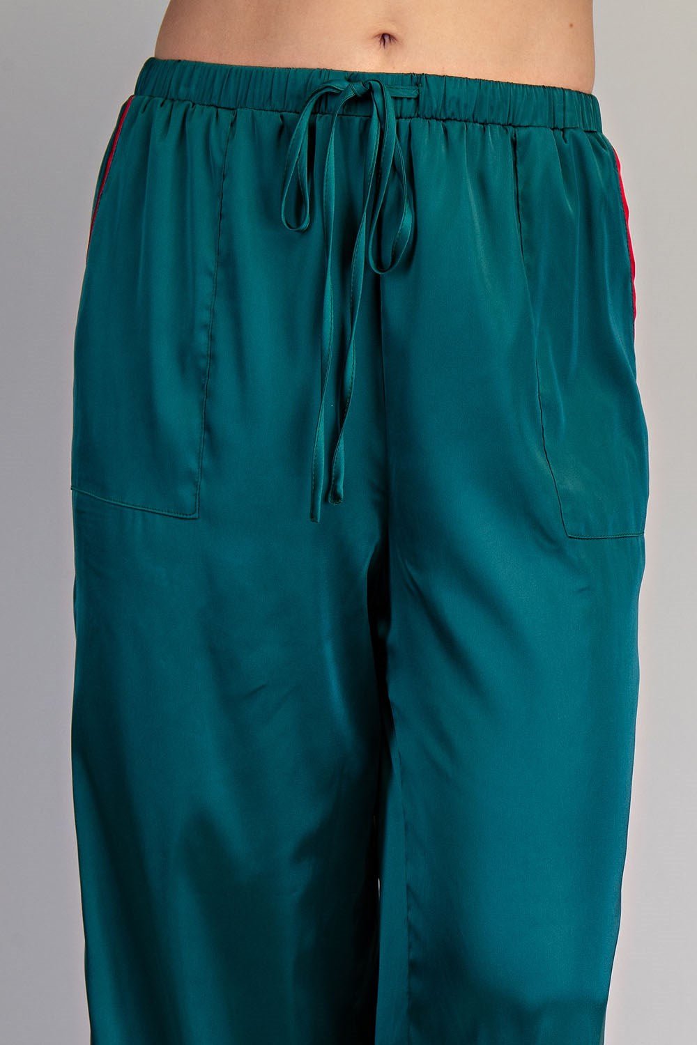 The silky satin fabric feels like a dream against your skin — lightweight, breathable, and smooth with that luxurious sheen we all love. The button-down top features classic piping along the collar and cuffs, while the matching wide-leg pants keep things comfy with an elastic drawstring waistband. The rich emerald green paired with red trim gives it that subtle holiday vibe without being over the top.