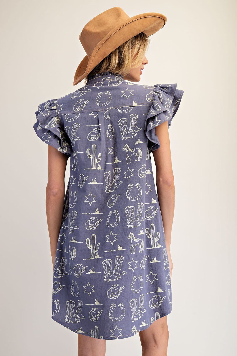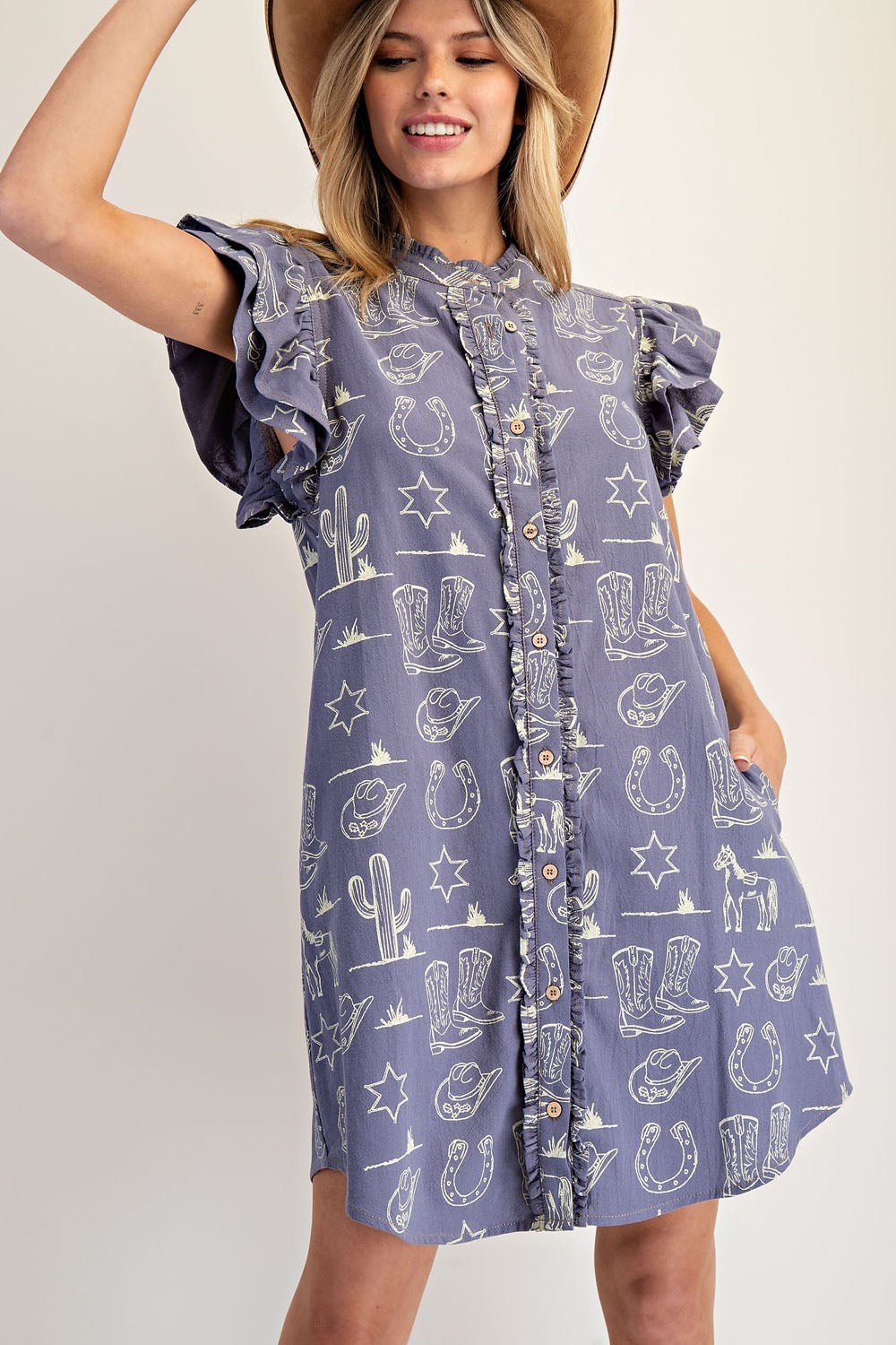 Bring playful western charm to your wardrobe with this soft washed, button-front mini dress. Featuring an allover cowboy-themed print with boots, horses, and cacti, it’s perfect for casual outings, festivals, or adding a fun statement to your everyday style. The dress is designed with flutter ruffle sleeves and a ruffle-trimmed mock neck, creating a flirty and feminine silhouette.